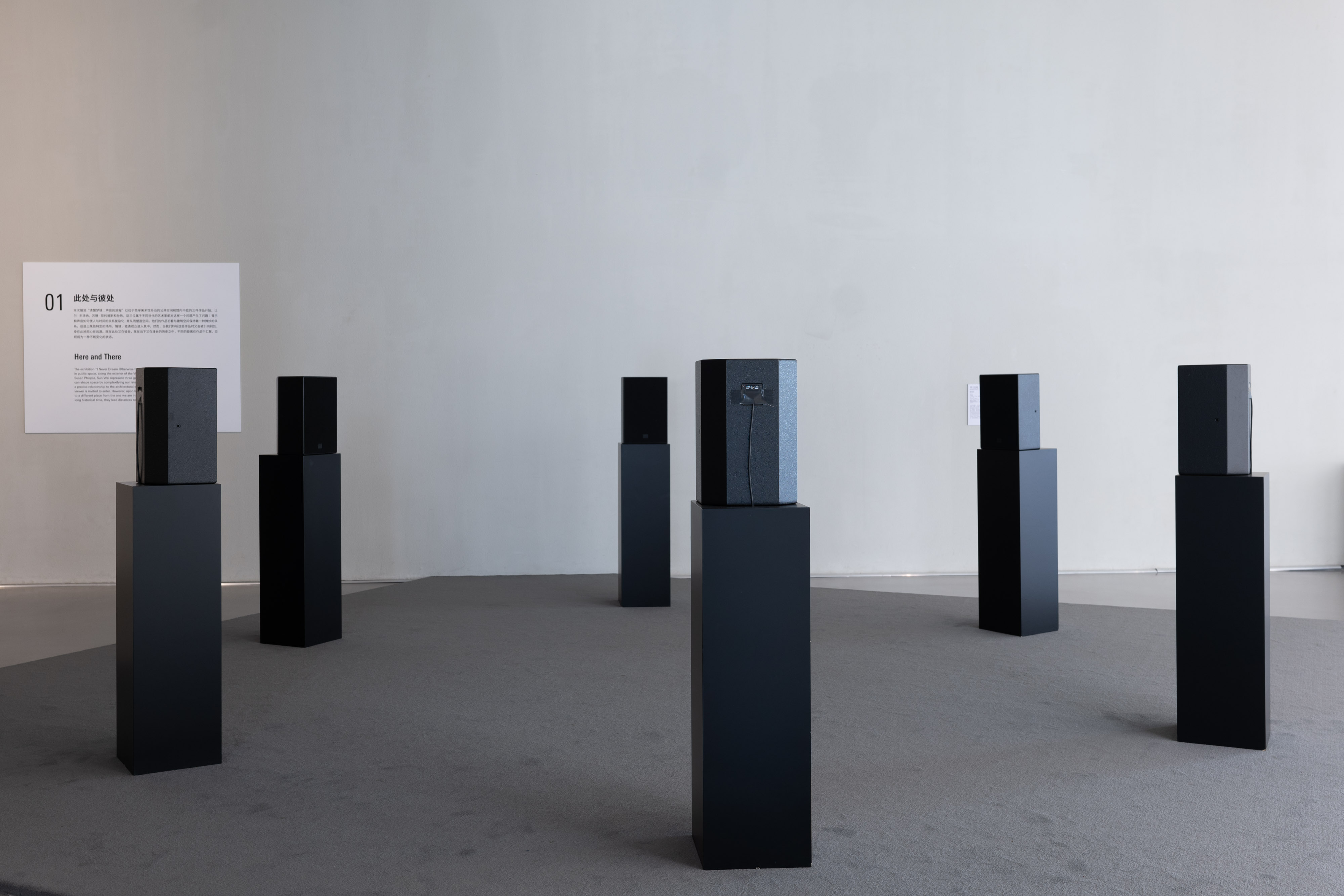 艺术家兼歌唱家苏珊·菲利普斯用六个扬声器围成一个圆圈,“无伴奏 ”演唱十三世纪一首英文歌曲 《春日已降临》的六个声部。这首以中古英语写成的圣歌可由四声部或六声部演唱,取决于原始乐谱的纵向排列,不同声部可连续演唱。墙上展标的 “介绍”开头写道:“四位同伴可以唱这一轮,但不得少于三位”。这首卡农曲是一种复调的(和协奏曲)形式,其中第一个声部演唱的旋律随后由其他声部模仿,每个声部在稍后的时间进入,直到全部重叠。在《巢中布谷》中,苏珊·菲利普斯亲自录制了所有声部,并通过六个扬声器投射出来,每个扬声器对应一个声部,将模仿原则发挥到极致。这段歌词歌颂了新季节的到来,布谷鸟开始歌唱,花朵开始绽放。这首曲子最初是在怎样的环境中传唱我们不得而知,但它显然具有仪式感和集体意义。在这里,作品唤起了一种关于民间舞蹈的联想,它的声音引导我们在展览空间中游走。